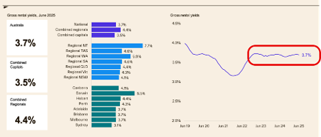Rental growth has steadied nationally, with gross yields at 3.7%. Darwin is the standout with 6.5% yields and regional NT pushing a massive 7.7%. Cate suggests investors may be pushing up rents post-renovation or after long-standing leases end. Meanwhile, Melbourne’s rental growth remains sluggish at just 1.2% annually – possibly a story more about the past exodus of investors than current conditions.