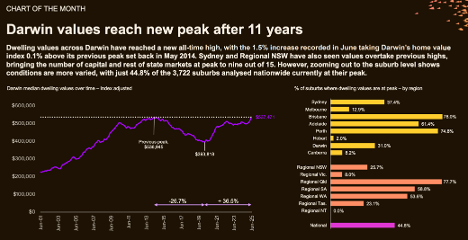 The national market edged up in June, with every capital city posting gains except Hobart (down 0.2%). Darwin led the charge with a 1.5% monthly gain across dwellings, and houses jumped 1.8%, pointing to renewed investor interest. However, only 31% of Darwin’s suburbs are at their peak – suggesting targeted activity in a few suburbs rather than widespread growth.