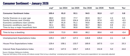 The Consumer sentiment index tells an interesting story, particularly when “Time to Buy a Dwelling” is contrasted to the same period, last year. Interest rate speculation doesn’t seem to have impacted sentiment for this measure as many would have imagined.